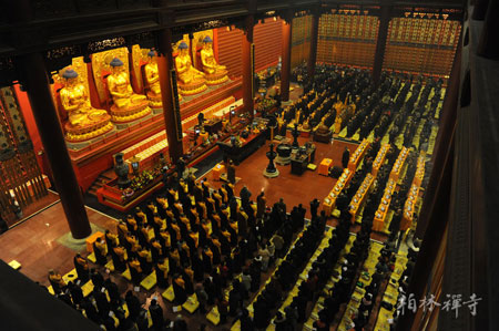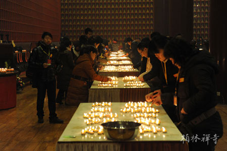 晚6点半,供灯法会在万佛楼举行,全体僧众及与会者依《普贤愿海灯明供养法》殊胜仪轨,以明灯为供养,祈愿龙年风调雨顺,国泰民安。
