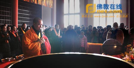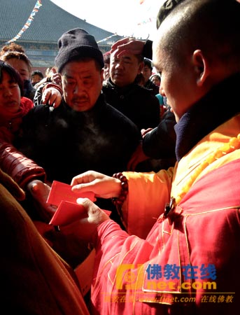2012年1月27日,农历壬辰年正月初五,辽宁大连观海寺隆重举行大黑天财神共修法会,法会由观海寺住持义辉法师亲自主法。当天,一千余名信众参加了此次法会。法会结束后,义辉法师就佛教的财富观和在自家信众求取善财的用心为信众作了开示,并为参加法会的信众每人派发一个财神红包,祝愿广大信众2012善财广进,阖家安康。