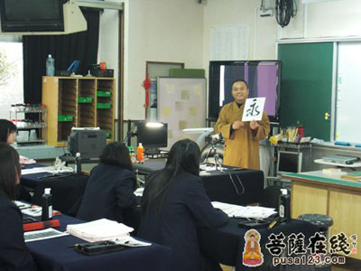 2012年2月13日,江苏扬州大明寺都监仁风法师应邀参观了日本奈良县立樱井高等学校。在此期间,仁风法师向同学们介绍了扬州大明寺的历史、概况及发展,介绍了扬州与奈良的友好关系,并与学习书道的同学们进行了亲切的交流。还特别亲笔挥毫,写下一个“永”字送于同学们,望同学们努力学习,练好书法,发挥其灵感创作出更多优良的作品。