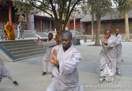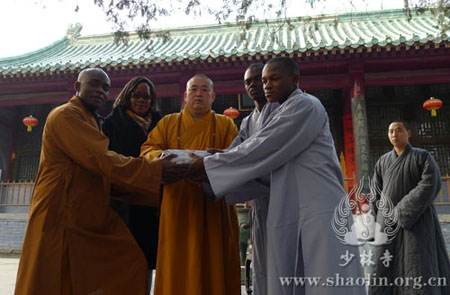 2012年2月19日,来自非洲的六名少林弟子与永信方丈一同在少林寺方丈室前欢迎新来的四名弟子。目前,少林寺已经有十名来自加蓬、喀麦隆、乌干达、科特迪瓦、刚果(布)的非洲弟子来到少林寺学习。少林寺将免费为他们提供三年食宿,以学习少林文化。