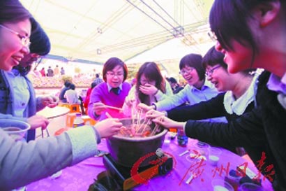 游人们在品尝独具珠三角特色盆菜斋宴。(图片来源:中新网 摄影:黄幼谦)