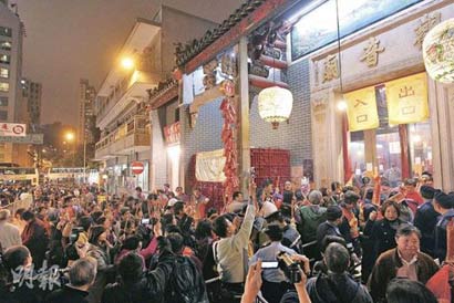 2月17日晚11时开始,香港多间观音庙通宵开放供市民善信借库。当中位于红磡的观音庙,警方临时封锁部分行车路段,并在球场架起铁马,让市民排队及有秩序进入观音庙借库祈福,现场香火鼎盛。(香港《明报》)