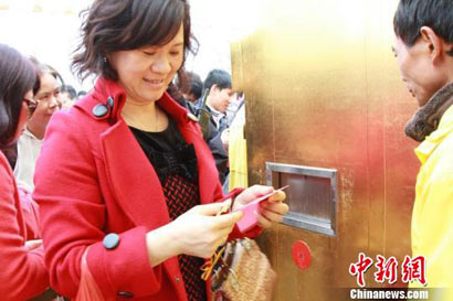 记者看到,在南海观音文化苑广场“借库”体验区,摆着一个金光闪闪的观音大金库,游客手抱金光闪闪、特制的大金钥匙,排着长龙开金库,金库里面储放着利是封,伸手进去取一个利是封,里面装着面额上亿元的支票与开过光的观音圣像,金额越大,表明新的一年财运越旺。拿到大额“支票”的游客都欣喜若狂。