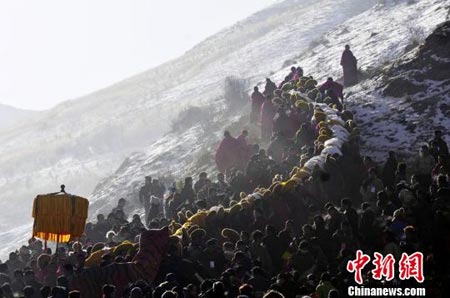 大约中午时分,在众僧的诵经声中,“沐浴”了阳光的无量光佛像唐卡被小心翼翼卷起,由百名喇嘛肩扛着、众人簇拥着送回了寺院。