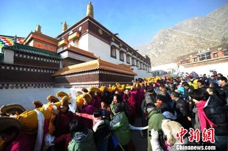 2012年2月4日,有“世界藏学府”之称的甘肃拉卜楞寺举行晒佛节,展晒巨型佛像唐卡。每年正月十三的晒佛节是当地一年中规模最大、最为隆重的宗教节日,今年展出的是无量光佛,来自世界各地的数万僧众瞻仰了这一佛像。