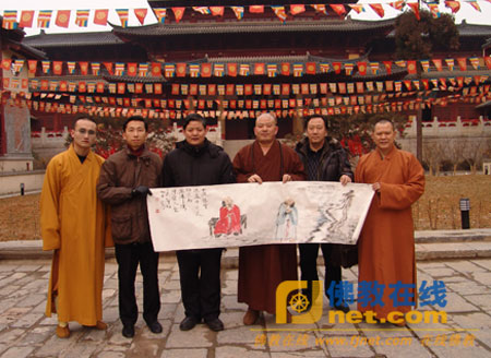 中佛协领导一行在传义法师陪同下,参观了毗卢寺修缮的大雄宝殿和新建禅堂、财功德堂。随后,双方进行了座谈交流,王健秘书长讲到毗卢寺大雄宝殿的修缮,使整个寺院的面貌焕然一新,寺庙格局会变得更加美观。最后,传义法师向中佛协领导一行赠送了自己的作品。
