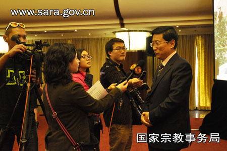 当天,国家宗教事务局副局长蒋坚永,国家宗教局一司司长徐远杰、港澳台办主任郭伟,中国佛教协会秘书长王健,澳门特别行政区社会文化司司长办公室主任张素梅,组委会主席团副主席释健钊长老,澳门特别行政区文化局局长吴卫鸣,组委会主席团副主席刘艺良、梁安琪、刘国梁等嘉宾出席了新闻发布会。新华社、中央人民广播电台、澳门日报、澳门电视台、凤凰卫视、文汇报等25家媒体到现场进行报道并踊跃提问,三位发布人积极回应,蒋坚永副局长也应几家电视媒体邀请现场接受了采访,发布会在热烈掌声中圆满结束。(图片提供:张雪梅)
