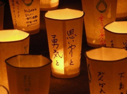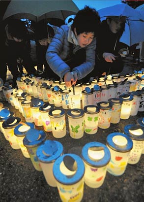 3月11日,在日本福岛县举行的“3·11”大地震一周年纪念活动上,人们点燃蜡烛悼念逝者。(图片来源:新华社)