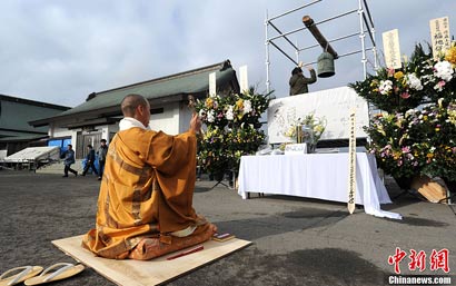 从3月11日下午开始,增上寺住持为死难者举行一周年忌的法事活动。14:46分,所有祭奠人员集体起立,为死者默哀。(中新网)