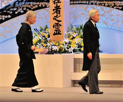 日本天皇明仁(右)和皇后美智子参加悼念仪式。(图片来源:新华社)