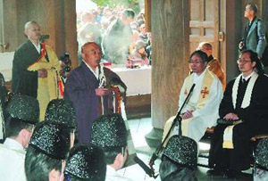 下午2点半,日本鹤岗八幡宫20余名神职人员、镰仓市基督教会神父、牧师30余人、市内40多所寺院60余名僧侣列队,围绕大殿缓步经行。