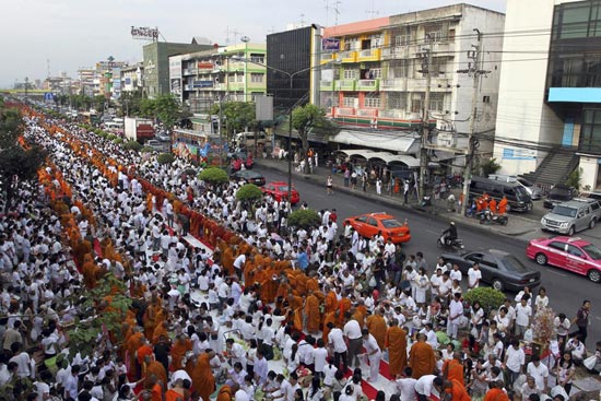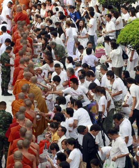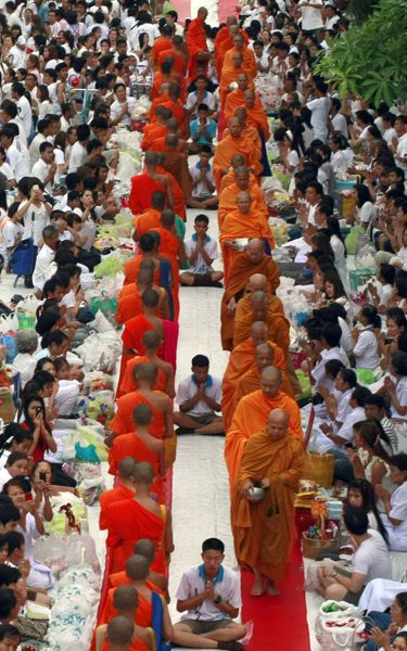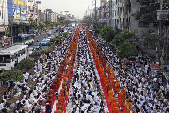 当地时间2012年3月10日,适逢释迦摩尼诞辰2600周年,泰国曼谷僧侣们集体上街接受民众布施。