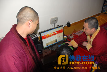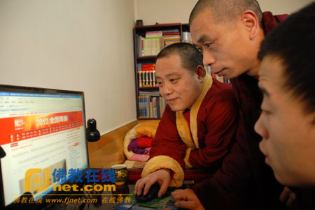 2012年3月7日,山西省五台山菩萨顶几位僧人正在上网看“两会”报道。“两会”召开以来,五台山各大寺院的僧人在诵经祈福的同时,利用网络、电视、报纸等渠道积极学习“两会”精神。(图、文:高峰毅 、焦瑾琦)
