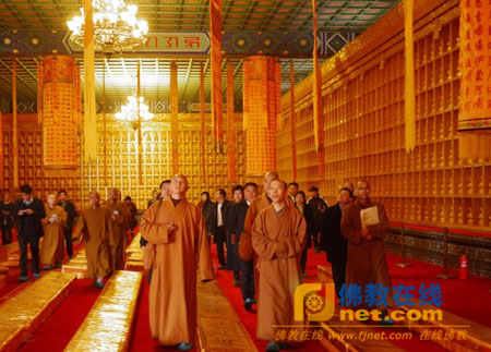 参访团一行在法闻法师与北京首政集团王小明总经理的陪同下进入寺院,参观了寺院的各个殿堂,并在万佛殿内礼佛。其间,台湾南部大智寺住持法一法师为信众开示,劝现代人切莫让游戏、电视等空费大好时光,应常怀大爱、慈悲、宽容之心做事待人。法闻法师也讲到希望两岸佛教界多多开展交流,请台湾的法师们以后多到普照寺为大众讲经开示,愿两岸佛教交流在普照寺生根、开花、结果。