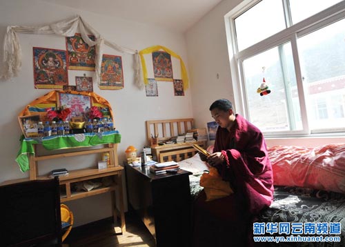 喇嘛学员诺桑扎巴在自己的宿舍里看书(图:新华社记者 蔺以光)
