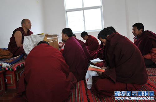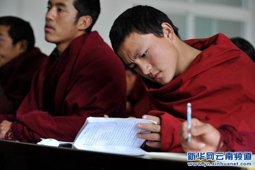一些喇嘛学员在上佛学理论课(图:新华社记者 蔺以光)