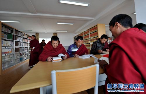喇嘛学员在图书室里看书(图:新华社记者 蔺以光)