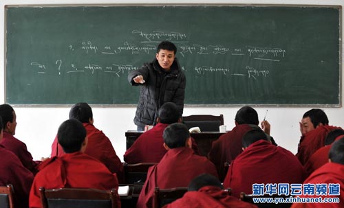 藏族教师边巴扎西(中)为喇嘛学员上藏文课(图:新华社记者 蔺以光)