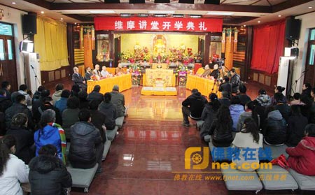 2012年3月17日上午9时,维摩讲堂开学典礼在北京佛教居士林隆重举行。当天,北京中国佛学院觉灯法师、容通法师、源流法师、宏海法师、定禅法师,北京广化寺然教法师,北京佛教居士林夏法圣理事长、吴炎主任,中国社会科学院世界佛教研究所嘉木扬·凯朝博士等多位授课讲师出席典礼。