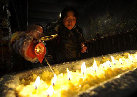 3 月1 日是藏历水龙新年正月初八,拉萨各大寺院举行一年一度的传召法会,众多信教群众从四面八方赶来朝拜、听经、布施,整个寺庙充满了浓浓的宗教节日气氛。(图:新华社记者 觉果摄)