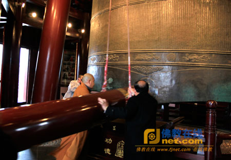 秋爽法师和陈声汉理事长共同敲响寒山大钟