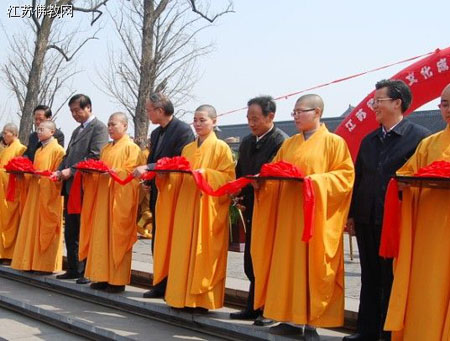 中国佛教协会副会长、江苏省佛教协会会长心澄大和尚首先致了欢迎词,镇江市委副书记曹当凌先生做了讲话后国家宗教局一司副司张裴飙先生讲话,他说;“……江苏省是一个佛教大省,江苏的诸多寺院享誉海内外,今天的盛会是江苏佛教界的大事,也是中国佛教界的喜事……”。随后江苏省委统战部副部长、宗教局记者莫宗通发言,他说;“……加强佛教文化建设是佛教文化与社会主义社会相适应的必然要求,也是实现我省佛教由外延扩张向内涵式发展、保持我省佛教健康发展的需要,本次佛教文化成果展示交流会收到全省各地佛教书刊、字画、照片、音像资料等数千件……反映了我省近年来佛教文化建设的主要成果……”。上午11;20,江苏省政协副主席张九汉等领导、诸山长老18人为大会剪彩。