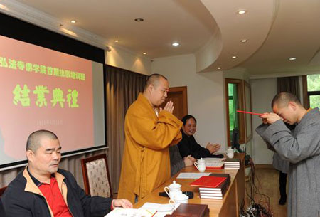 典礼由弘法寺佛学院校务总监刘玉民主持,副教务长宽江法师做了本期培训的总结,智空法师代表学员发言。罗湖区宗教局李立笔局长在发言中首先对学员结业表示祝贺,并向法师们寄语十二个字:“内强素质、外塑形象、担当责任”。因为这期培训班的学员都是来自各个寺院的领导,李立笔打比喻说,要树立“我是服务员”的思想,服务僧众、服务信众,领导就是要为大家服务,希望大家以良好的素质和形象担起弘法利生的责任。