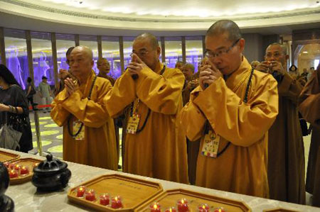 诚双手合十,现场充满庄严祥和气氛。心立法师表示,全世界的人能在此处瞻仰