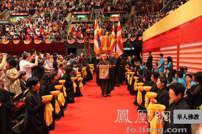 彩车抵红馆后,正式开始安奉大典。数百仙女献花迎接舍利,舍利宝塔在全场念诵佛号声中移到礼台上安座。