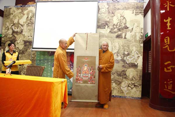 之后,东林慈善功德会会长镜义法师向秋爽法师赠送了精心装裱的佛像一幅,略表对秋爽法师及重元寺常住的感谢之情。
