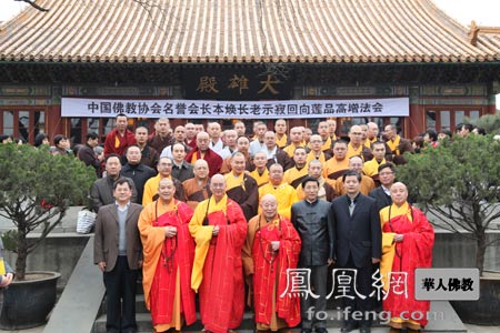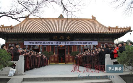 国家宗教事务局蒋坚永副局长、办公室陈红星主任、一司刘威副司长,中央统战部二局石云副处长,中国佛教协会学诚副会长,王健秘书长,宗家顺、卢浔、演觉、常藏副秘书长与首都佛教四众弟子五百余人参加法会。(图片来源:凤凰网华人佛教 摄影:陈星桥)