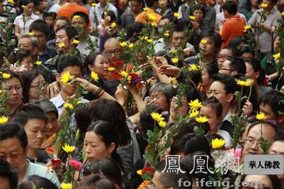 2012年4月2日下午三点到4月4日下午6点,在接受公众吊唁的52小时内,共有近30万人赶往弘法寺,排着长长的队伍,手捧鲜花敬献于长老灵前。长老端坐佛龛,面色红润,如同生前接受信众礼拜一般。只是,长老的眼睛再也不会睁开了,再也不会有人敲着大家的头,说“发财、发财、发大财;发心、发心、发大心”了!此情此景,让不少信众难掩哀痛、思念之情。