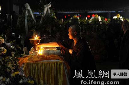 从外地赶来的法师在本老灵前点上香烛(图片来源:凤凰网华人佛教 摄影:无花)