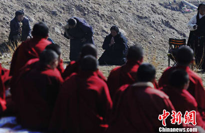 9时,法会在天葬台前正式举行。数百名僧侣沿着山坡席地而坐,手握经书,开始为两年前地震中的遇难者集体诵经、祈福和超度。诵经声中,有数位民众跪在天葬台前用藏族礼仪默默叩拜,默念经文。