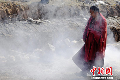 玉树僧众悼念逝者:点酥油灯献格桑花诵经祈福(图片来源:中新网)