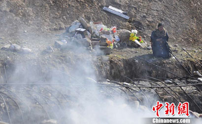 诵经声中,在玛尼石堆成的悼念碑前,有数位民众为逝者煨桑(用松柏枝等焚起的烟雾祭祀祈福),默念对逝去亲友的思念之情,然后跪在天葬台前以藏族礼仪默默叩拜,久久不愿起来。