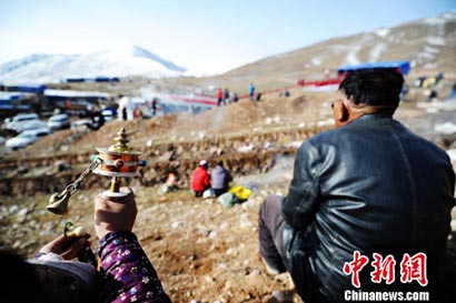 虔诚的藏民转动转经筒,悼念逝者(图片来源:中新网)