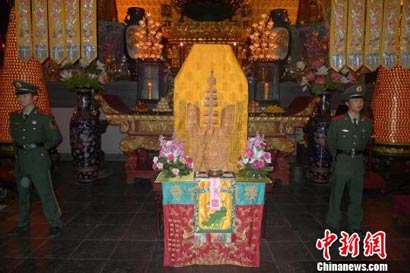 阿育王金塔被黄绸护盖护住,供奉于宝殿正中 (图片来源:中新网摄影:朱晓颖)