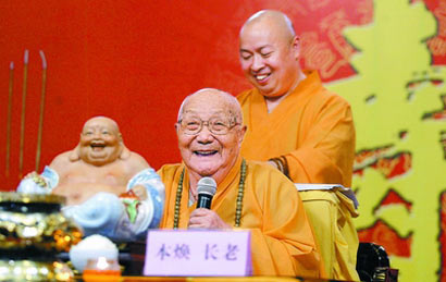 2011年本焕长老寿诞,笑容和面前的佛像如出一辙(图片来源:深圳弘法寺 摄影:张定平)