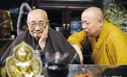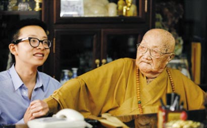 印顺大和尚摸摸师傅的脸说:“106岁,牛,你的脸很光滑,不显老。”(图片来源:深圳弘法寺 摄影:张定平)