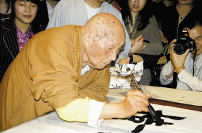 本焕老和尚卷起衣袖写字,字字铿锵有力(图片来源:深圳弘法寺 摄影:张定平)