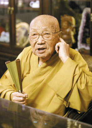 老和尚说,他106岁了,耳朵虽有点聋了,但脑子很清醒,每天听新闻记新闻呢(图片来源:深圳弘法寺 摄影:张定平)