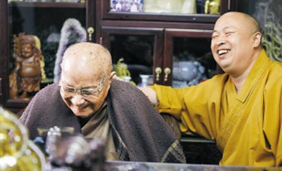 随后两人旁若无人地哈哈大笑。师徒两人感情隽永,印顺大和尚时常逗得老和尚开心大笑(图片来源:深圳弘法寺 摄影:张定平)