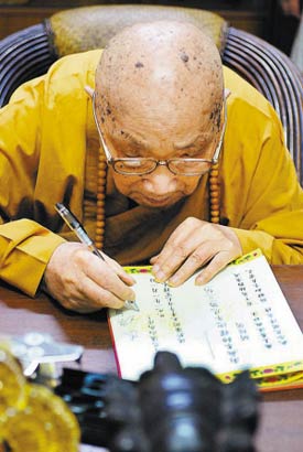 本焕老和尚在血经上写字祈福(图片来源:深圳弘法寺 摄影:张定平)