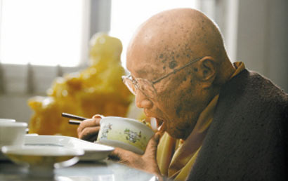 本焕老和尚对吃饭有着自己的认识,绝不浪费一粒粮食,端碗持筷,不碰碗沿,大口吃饭,大口喝汤(图片来源:深圳弘法寺 摄影:张定平)