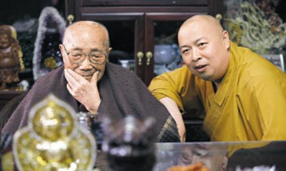 一名香客准备和老和尚合影,老和尚一看香客的手拿得太高,挡住脸,他主动用力将香客的手压下,然后才合影。 (图片来源:深圳弘法寺 摄影:张定平)