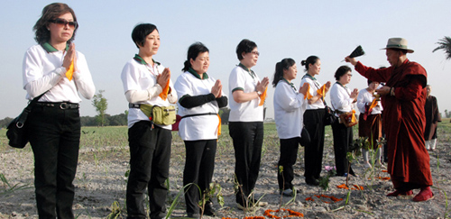 这趟朝圣行,除了朝礼佛陀八大圣地外,并特别来到东印度比哈(Bihar)省政府最西端的西坎巴兰县(WestChamparan)劳里亚南丹加村(LauriaNandangarh)村朝礼“阿育王柱”,“劳里亚南丹加村”除了是当初佛陀卸下王子服及首饰,交给侍从,坚定地落发出离之处外,更是世界上阿育王柱保存的最完整之处。相传孔雀王朝阿育王早年四处征战,晚年深感罪孽深重,受僧人感化,为了弘扬佛法在各地设立阿育王柱,上面刻有经文教育民众,然而经过千年的岁月洗礼,目前唯有此地仍然保存有完整的阿育王柱。为了表示对灵鹫山长年致力于“爱与和平地球家”的推展与努力,比哈省政府决定将村里一块紧邻当地地标阿育王柱、面积广达5公亩的土地,无偿赠与灵鹫山佛教教团,做为未来成立灵鹫山禅修中心之用,心道法师也带领弟子们在这块土地上种下菩提树苗,象徵将佛法的树苗再次播下,可谓意义深远;此外,心道法师也特别於西坎巴兰县举办了一场“观音百供法会”,西坎巴兰县各级政府及当地老百姓都来到法会现场,在法会结束後,不论老少,都与心道法师学习念诵观音心咒,现场气氛温馨祥和,宛若佛国!