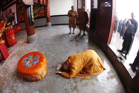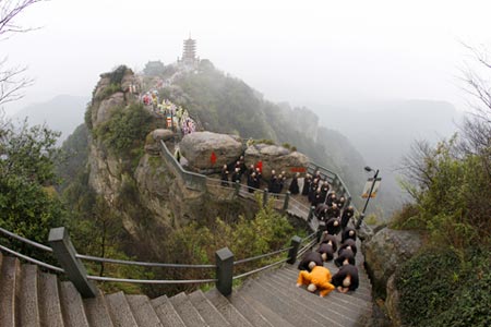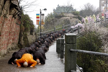 5时,在炉峰禅寺净芳法师的带领下,四众弟子和善男信女三步一叩,五体投地,顶礼佛足,忆佛深恩,从天王殿开始,经大雄宝殿、般若之门、四面观音殿、双余亭、御风楼、青翠亭、南天竺牌坊、心经摩崖石刻,逶迤而上,直至山巅的观音宝殿,历时近五个小时,千人队伍在绵延二公里的山路上匍匐前行,如法如仪,场面壮观。