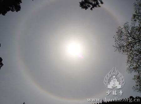 在浴佛节大法会进行时,天上忽现一道弧形光线,状若彩虹。随后,太阳被光圈环绕,龙天欢喜,一片祥瑞之相,实乃佛力加被、泽被苍生之福瑞也!