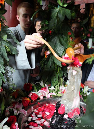 上午九时,龙天护佑,坛场庄严。少林寺常住院大雄宝殿内,香花灯烛,梵呗缭绕。香花丛中放置铜盆,盆中香汤由旃檀、紫檀、郁金、龙脑、沉香、麝香、丁香等配制而成。汤中立着一尊水晶释迦太子像,法相庄严。永信大和尚拈香礼佛后,与全寺僧众及众位善男信女一起赞佛诵经、祝圣绕佛、唱浴佛偈。随后,僧众和信众们依次拿小勺舀汤浴佛,然后以香汤点浴自己,表示洗涤尘垢、荡涤烦心,使得身心清净,获得无上功德。